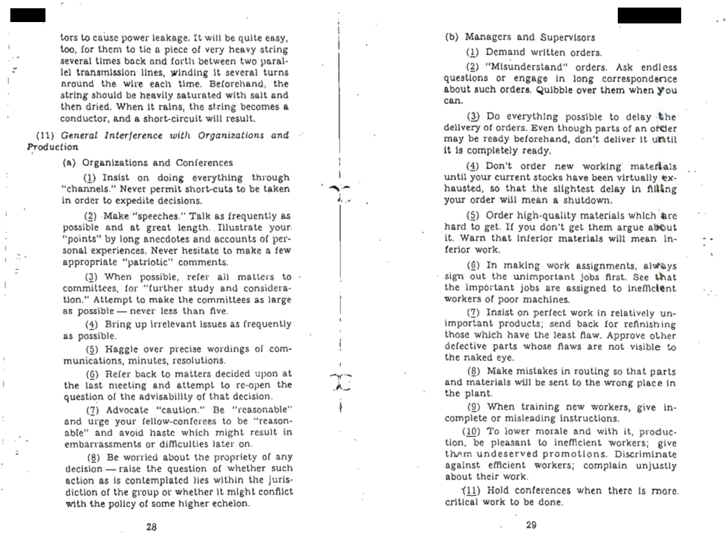 It was the end of the Second World War in 1944, when the United States Office of Strategic Services released it’s Simple Sabotage Field Manual, a guide how to sabotage the occupying forces in occupied Europe. It was distributed as a secret pamphlet that was intended as a guidebook to citizens living in Axis nations who were sympathetic to the Allies. Together they are a reminder of how easily productivity and order can be undermined. I wrote a full blog post on it’s background, contents and learnings. But scroll or download the document directly.JTNDZGl2JTIwY2xhc3MlM0QlMjJpZnJhbWUtc2xpZGVzaGFyZS0xNng5JTIyJTNFJTNDaWZyYW1lJTIwc3JjJTNEJTIyJTJGJTJGd3d3LnNsaWRlc2hhcmUubmV0JTJGc2xpZGVzaG93JTJGZW1iZWRfY29kZSUyRmtleSUyRmlUNnE4ZzR2TDhEREV2JTIyJTIwZnJhbWVib3JkZXIlM0QlMjIwJTIyJTIwbWFyZ2lud2lkdGglM0QlMjIwJTIyJTIwbWFyZ2luaGVpZ2h0JTNEJTIyMCUyMiUyMHNjcm9sbGluZyUzRCUyMm5vJTIyJTIwYWxsb3dmdWxsc2NyZWVuJTNEJTIyYWxsb3dmdWxsc2NyZWVuJTIyJTNFJTBBJTNDJTJGaWZyYW1lJTNFJTNDJTJGZGl2JTNF