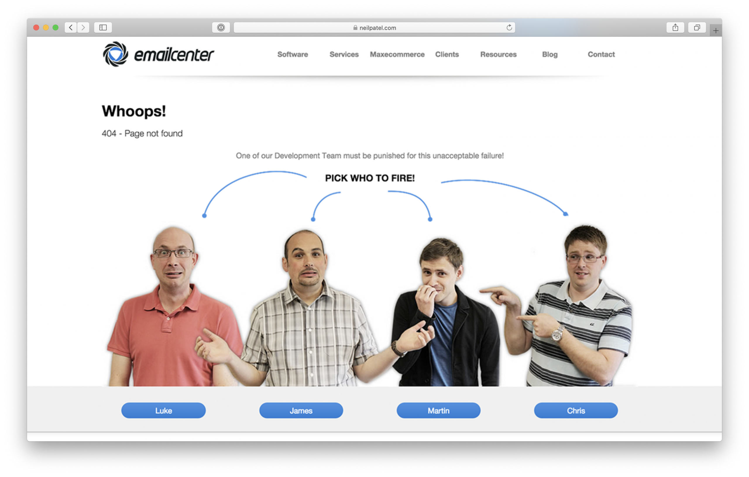 Email Center UK is super smart in adding some personality on its error 404 page. Not only do they accept a mistake by their developers, they ask you to ‘pick who to fire’.